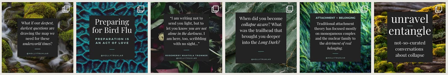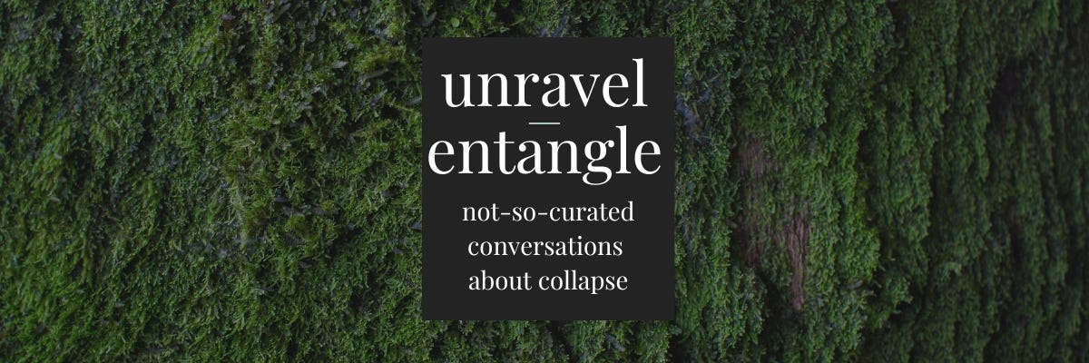 It's from this threshold space that I'm stirred to share several offerings on the horizon. First, Emily Rhae Swanson and I are creating an ongoing weekly container called UNRAVEL | ENTANGLE: Not-So-Curated Conversations About Collapse. Through conversation, imagination, and embodied practice, we gather around questions like: What if we welcomed both the unpredictable and unimaginable? What is the underculture we want to root in during this time of polycrisis?